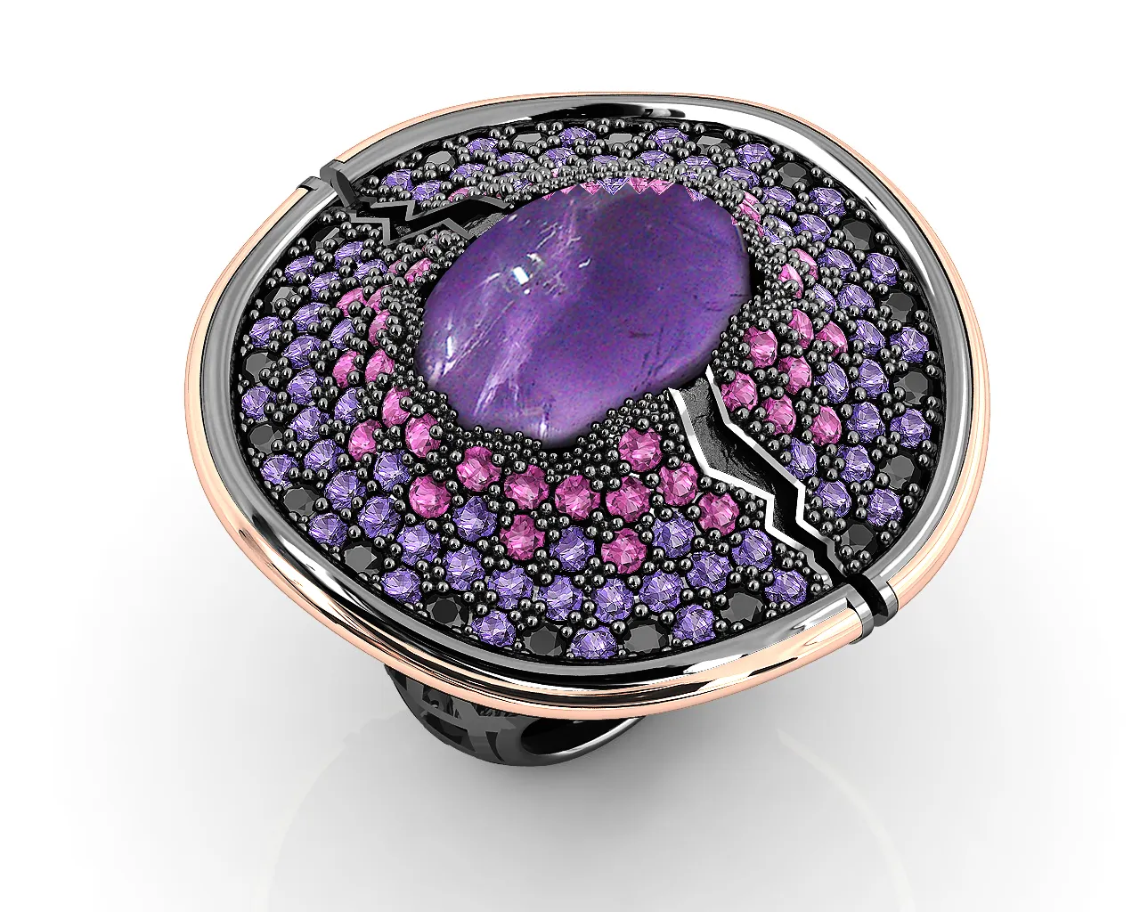 Δαχτυλίδι γυναικείο, ασημένιο, με φλούδα χρυσού Κ18, αμέθυστο, μαύρα σπινέλια ,βιολετί/ κόκκινα ζιργκόν & μαύρο επιπλατίνωμα, silverline, 0430647301