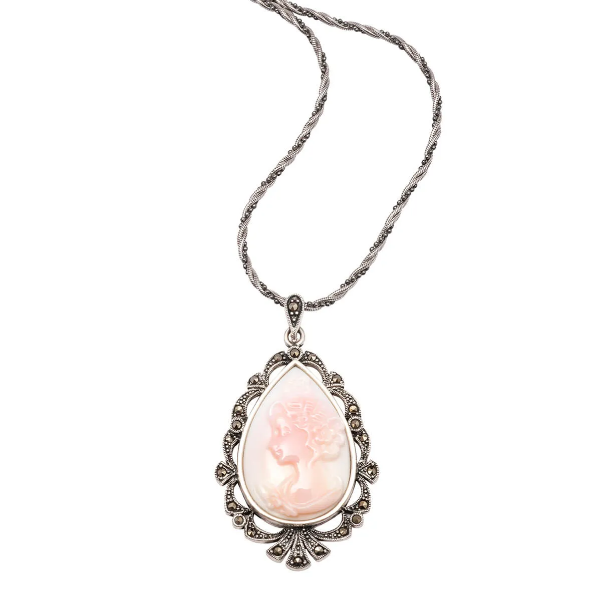 silverline, ασημένιο, γυναικείο, κολιέ, καμέο με ροζ φίλντισι & μαρκασίτες