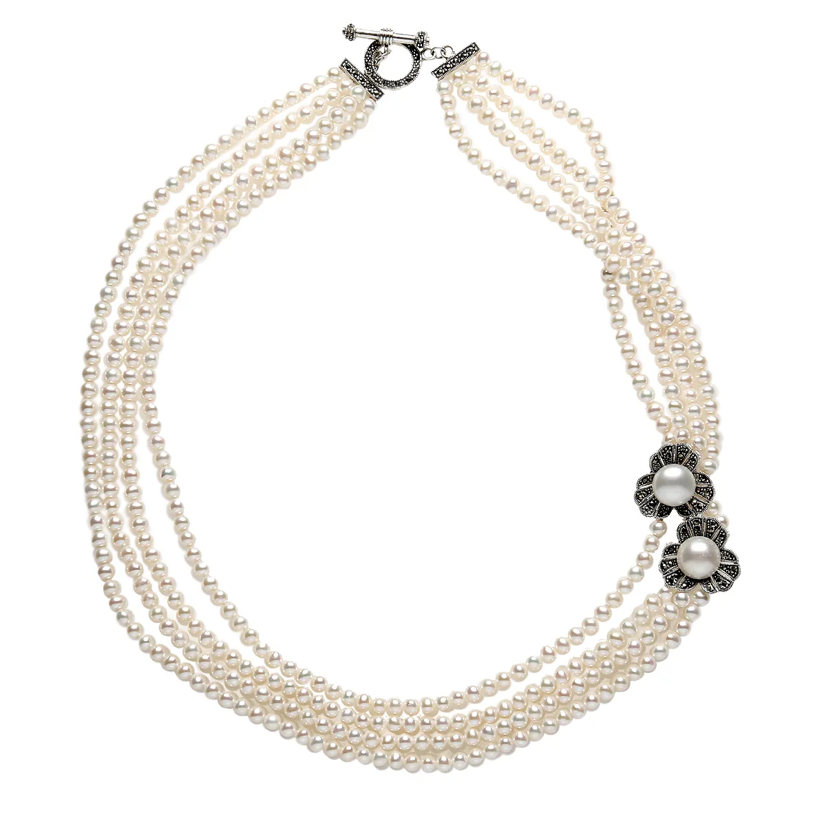 Μακρύ Κολιέ από ασήμι 925 με πέτρες μαρκασίτη, μαργαριτάρια και λουλούδια. Χωρίς νικέλιο.
