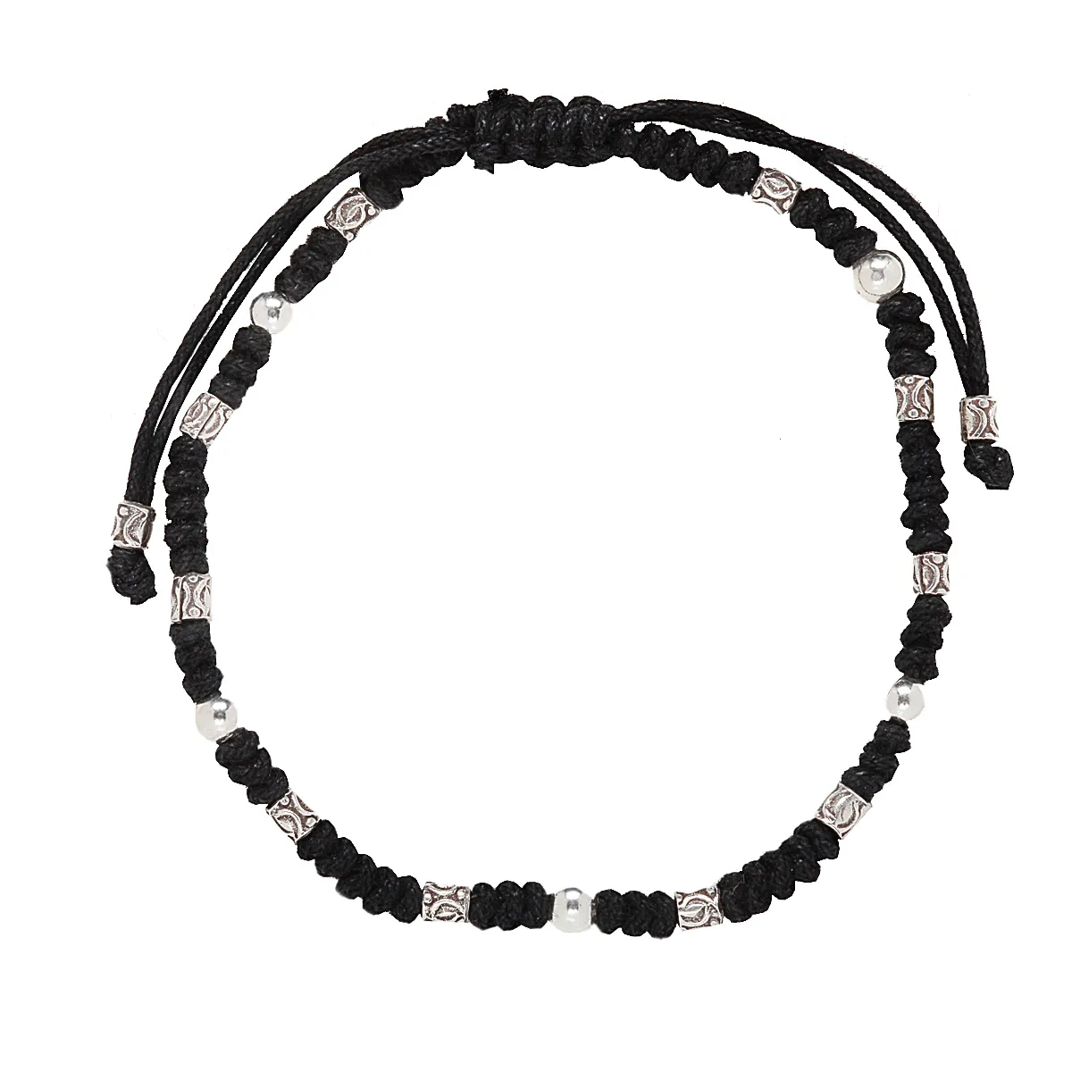 Λουστράτο βραχιόλι από οξειδωμένο ασήμι 925, με μαύρο βαμβακερό κορδόνι. Χωρίς νικέλιο, μεσαίου μεγέθους μήκους 18,5-19 εκ. και κούμπωμα.