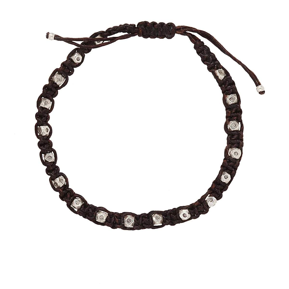 Λουστράτο βραχιόλι από οξειδωμένο ασήμι 925, με μαύρο βαμβακερό κορδόνι. Χωρίς νικέλιο, μεσαίου μεγέθους μήκους 18,5-19 εκ. και κούμπωμα.
