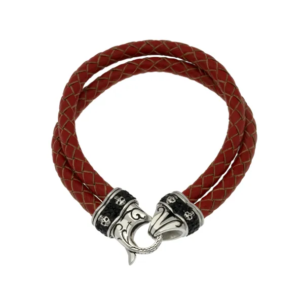γυναικείο βραχιόλι από ανοξείδωτο ατσάλι, δέρμα, μαύρα ζιργκόν και σχέδιο νεκροκεφαλής