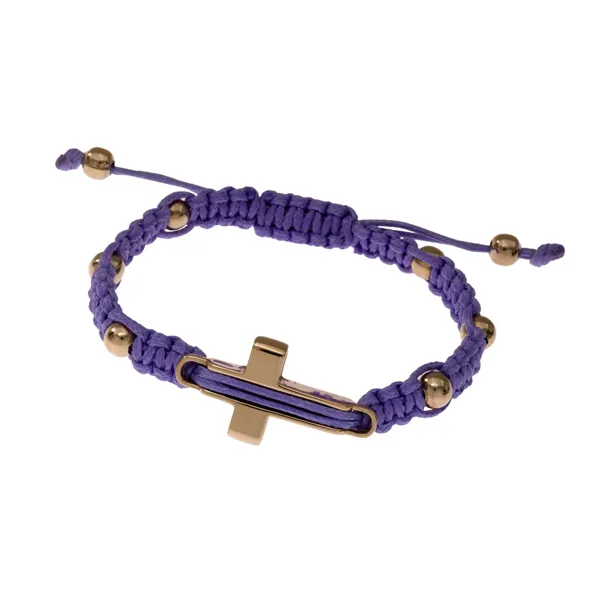γυναικείο βραχιόλι από ανοξείδωτο ατσάλι ροζ χρυσο με μωβ βαμβακερό κορδόνι, μακραμέ και σχέδιο σταυρού