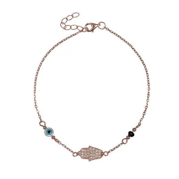 925 ασημένιο γυναικείο βραχιόλι, “μάτι βασκανίας και χέρι της Φατιμά”, με ροζ χρυσό και ζιργκόν, με ρυθμιζόμενη αλυσίδα επέκτασης.