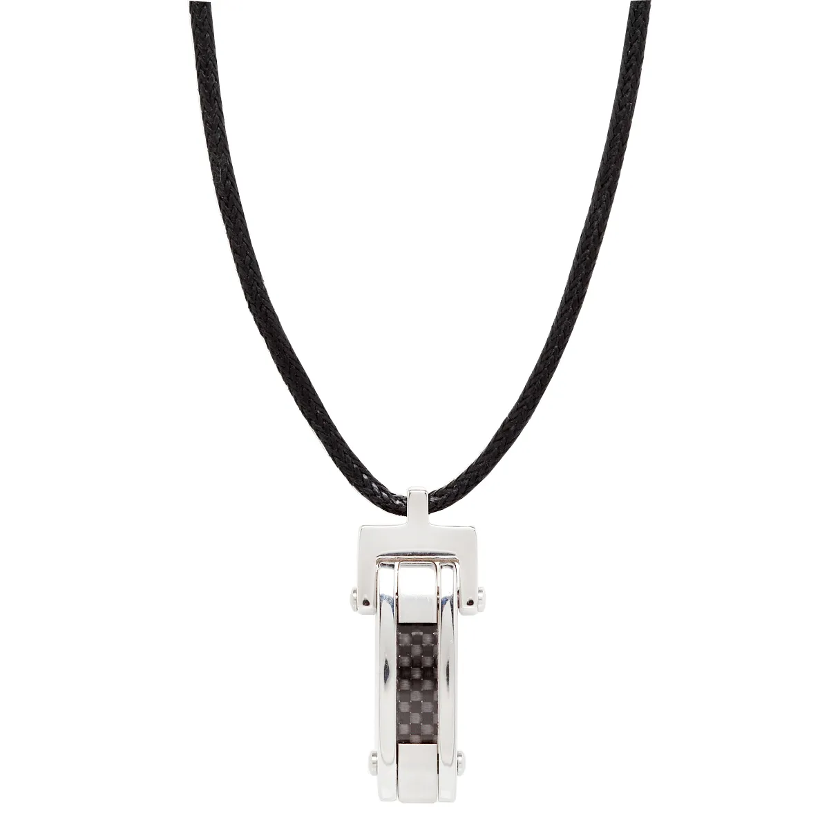 Ανδρικό κολιέ από ανοξείδωτο ατσάλι και λεπτομέρεια από ανθρακόνημα. Με μαύρο βαμβακερό κορδόνι.