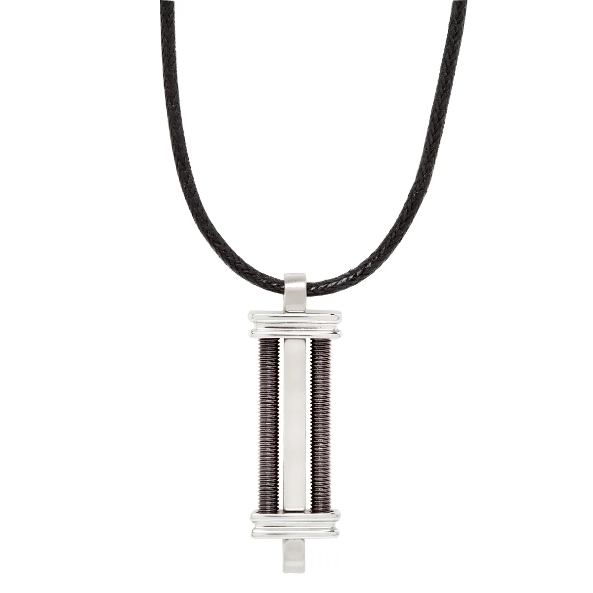 Λουστράτο κολιέ από ανοξείδωτο ατσάλι με δυο επιπλατινώματα: λευκό και μαύρο. Με μαύρο βαμβακερό κορδόνι.