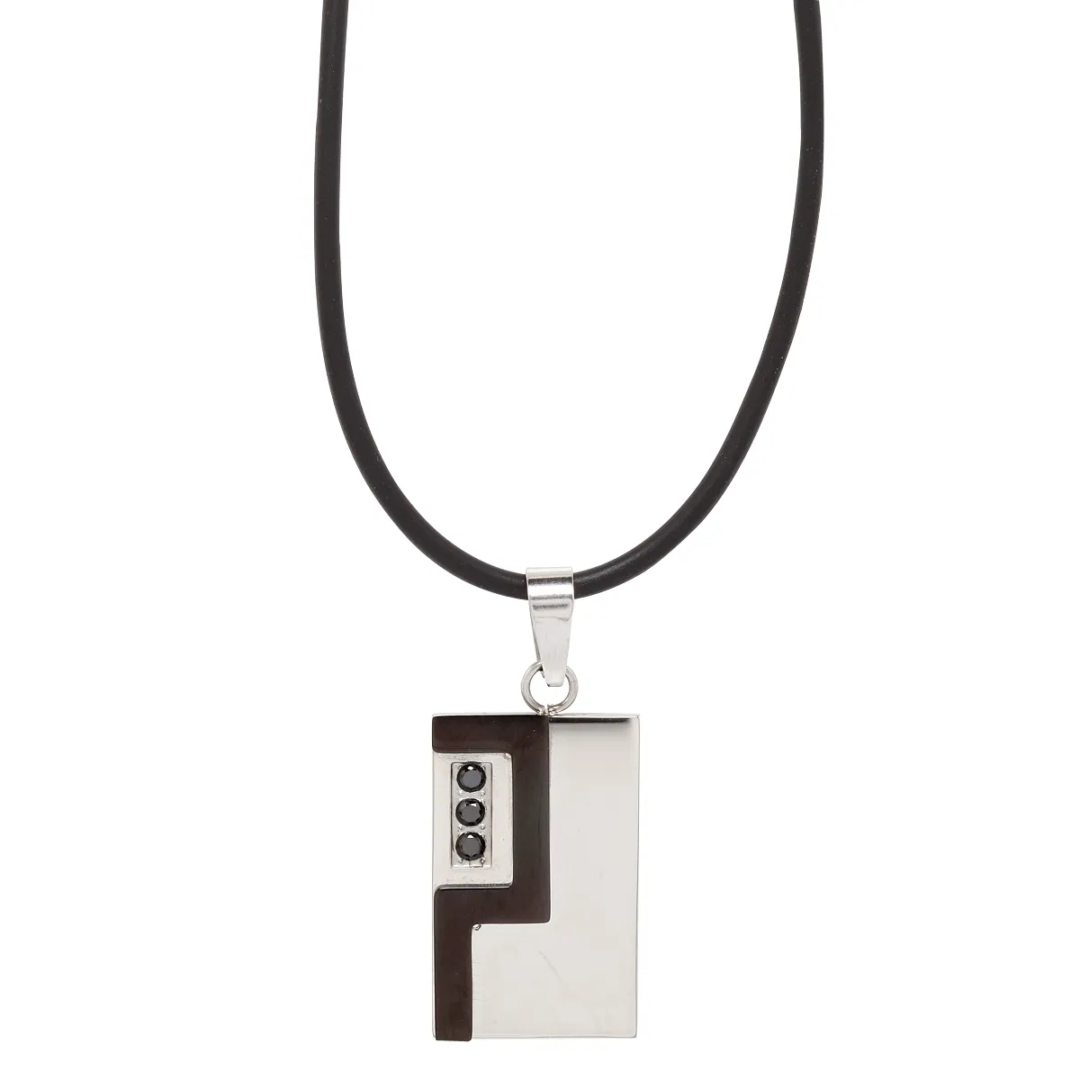 Λουστράτο κολιέ από ανοξείδωτο ατσάλι με δυο επιπλατινώματα: λευκό και μαύρο και μαύρα ζιργκόν. Με μαύρο κορδόνι από καουτσούκ.