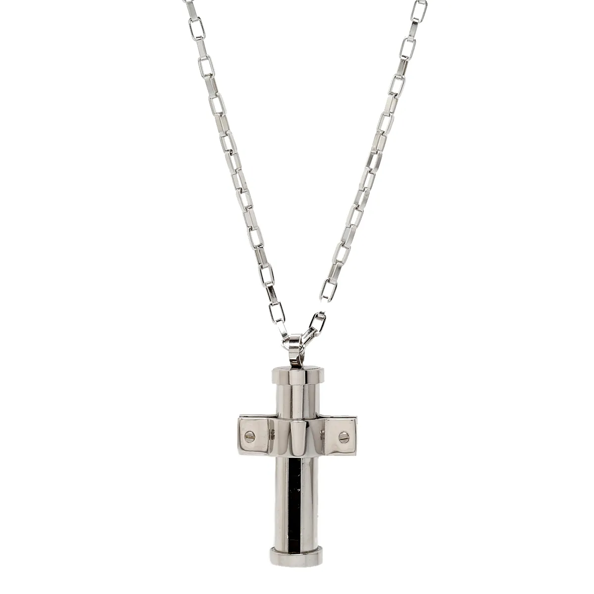 Λουστράτο κολιέ από ανοξείδωτο ατσάλι με σταυρό και λεπτομέρεια από ανθρακόνημα. Με αλυσίδα.
