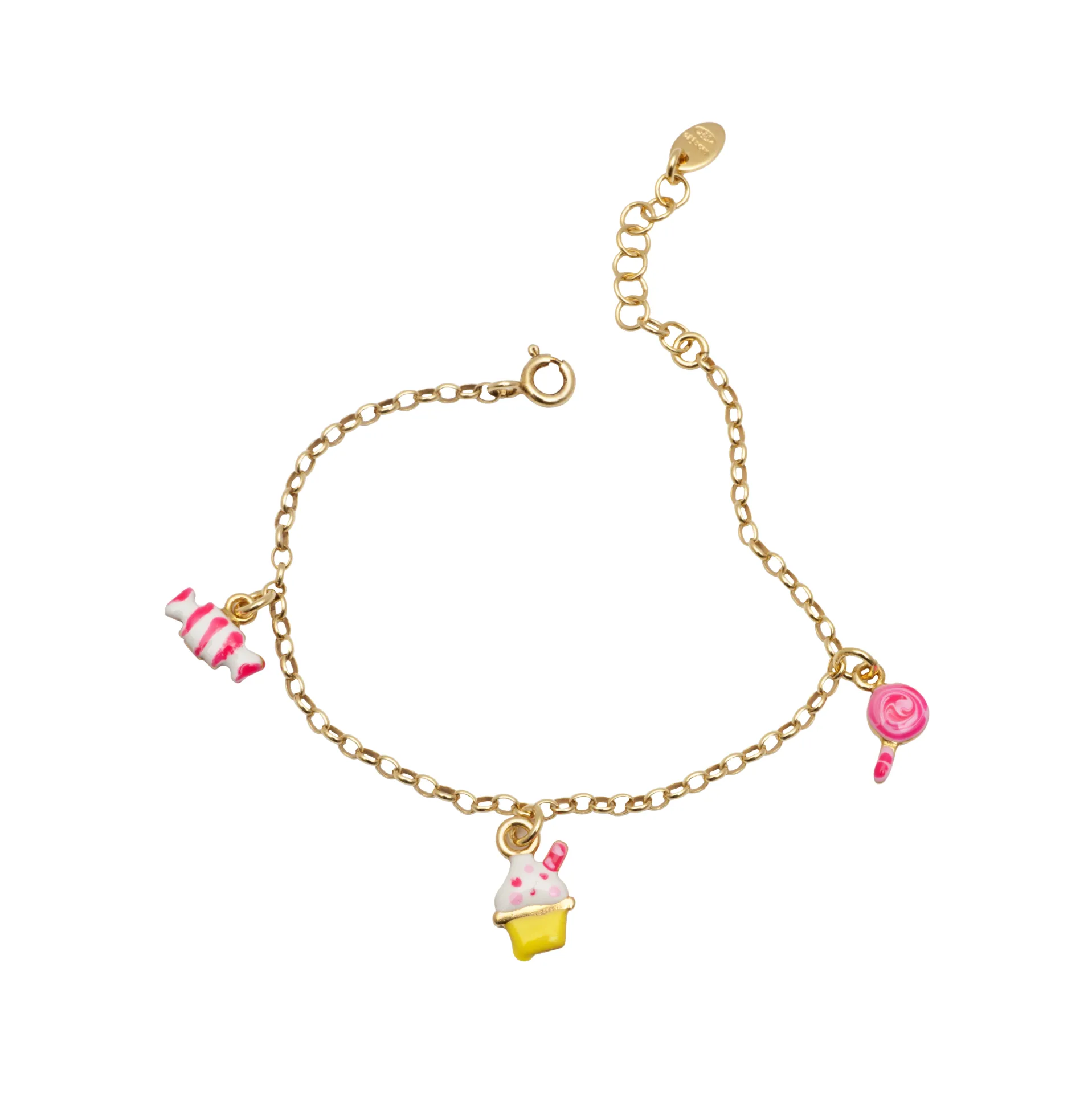 Woofie, ασημένιο, παιδικό, βραχιόλι, με σμάλτο ,κίτρινο επιχρύσωμα & κρεμαστά στοιχεία: παγωτό κυπελλάκι, καραμέλα & γλυφιτζούρι.